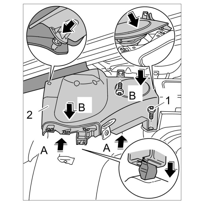 2. Insert trim panel for spring strut mount -2- in the side trim panel -Arrows A- and press down until the clamps engage -Arrows B-.