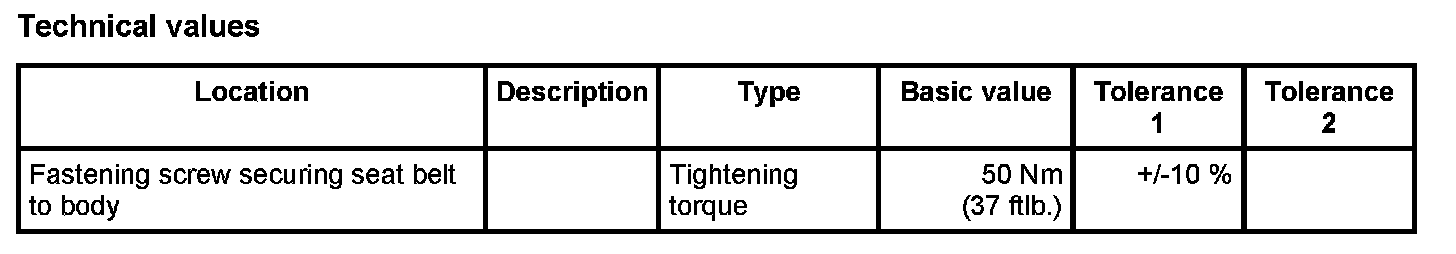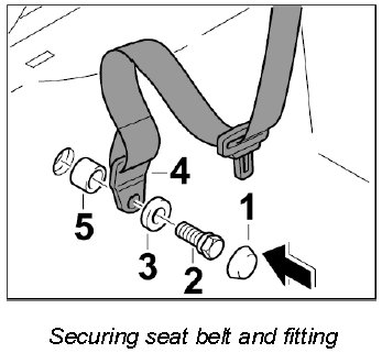 1. Secure fastening screw -2-, washer -3-, seat belt with fitting -4- and spacer sleeve -5- on the body. Tightening torque: 50 Nm (37 ftlb.) ± 10%