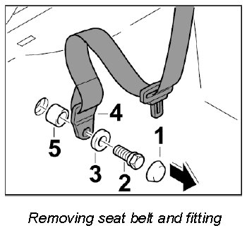 2. Unscrew fastening screw -2-. Remove washer -3-, seat belt mount -4- and spacer sleeve -5-.