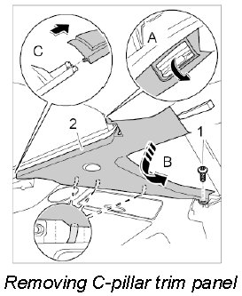 5. Unclip C- pillar trim panel -2- with a plastic wedge and remove in direction of arrow -B, C-.