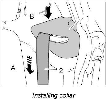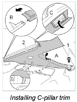 2. Insert C-pillar trim panel -2- in direction of arrow -A, B, C- and press in until the clamps engage.