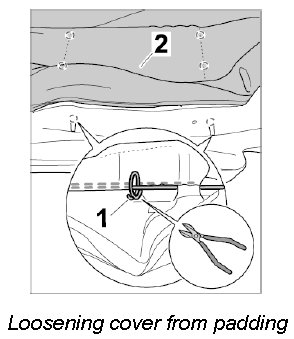 4. Cut open cushion clips -1- with side cutters and remove cover -2- from padding.