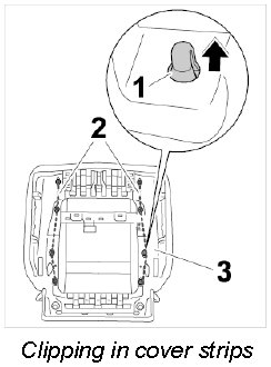 4. Position cover strips right and left -2- at the cut-outs provided to the padding and clip into the seat frame -3-.