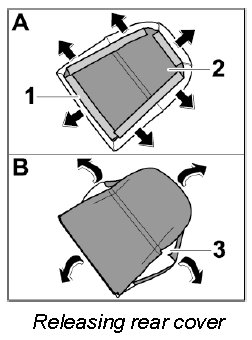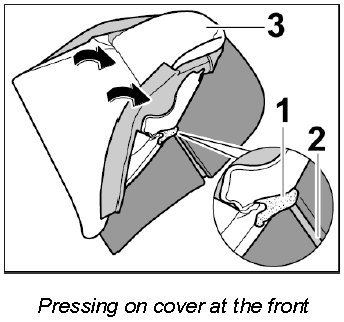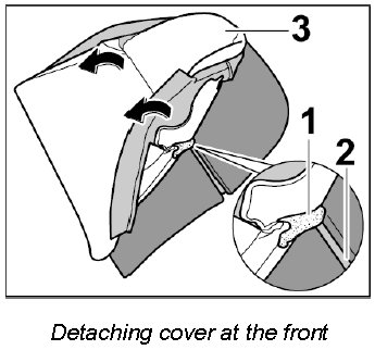 3. Carefully detach Velcro strip -1- on the cover from the Velcro fastener on the front of the padding -2- (-arrows-).