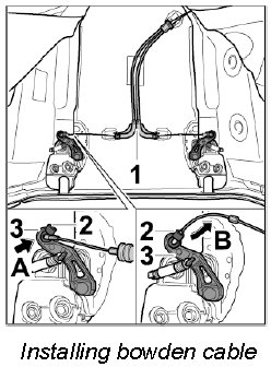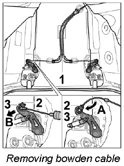 1. Disengage bowden cable at the left and right on the upper part of the lock.