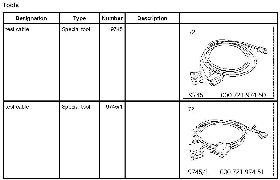 1. Connect the removed seat to the vehicle's wiring harness via test cable 9745 and test cable 9745/1.