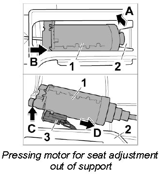 4. Pull motor for seat adjustment -1- forward under the support -2- (-arrow C-) and pull off connector -3- (-arrow D-).