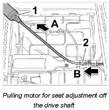 3. Pull motor for seat adjustment -1- off the short drive shaft -arrow B-.