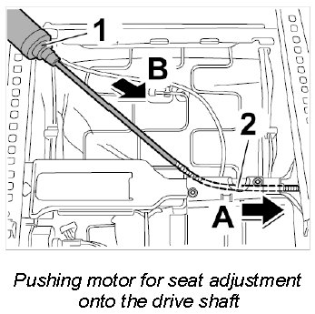 5. Push motor for seat adjustment -1- under the support -2- (-arrow B-).