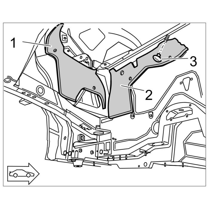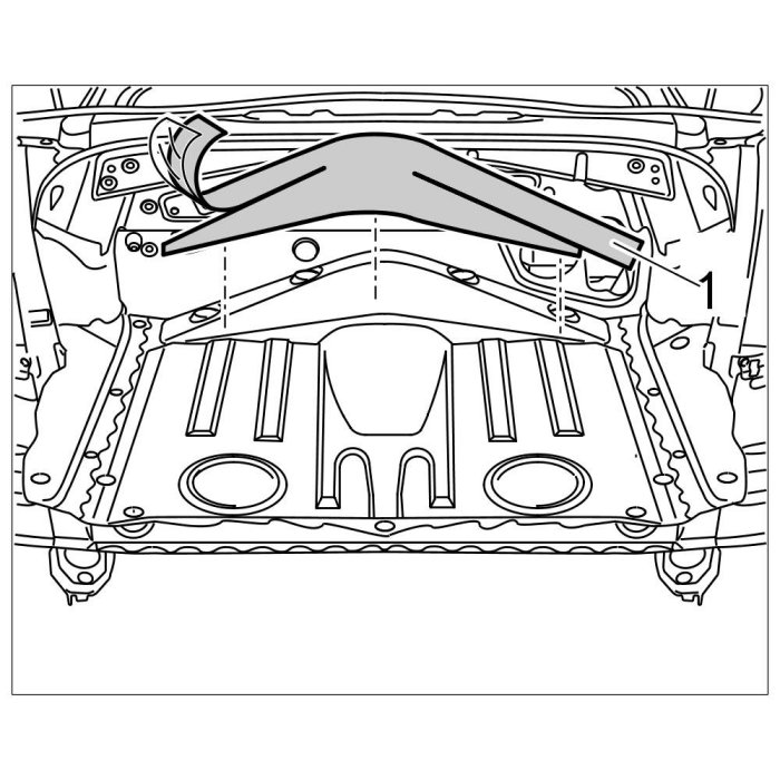 1. Pull off protective film and stick sound absorber for left side of engine compartment -1- on the body.