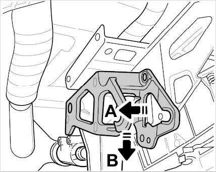 (Also remove clutch pedal switch and interlock switch, if necessary) -> Bracket for clutch power spring. Carefully move bracket for clutch power spring approximately 2-4 mm to the left -A-. Carefully turn bracket for clutch power spring clockwise by approximately 10-15 degrees on the pedal bearing axle -B-. Remove bracket for clutch power spring to the left.