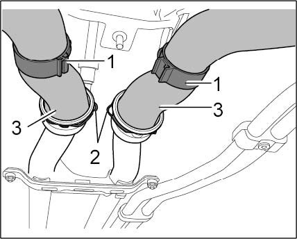 2. Remove inlet and outlet hoses from radiators. Do this by pulling off the spring clips for the two Henn couplings -2- and pulling the hoses away from the coolant pipes -3-. Collect coolant in a clean container. After draining the coolant, insert the clamps in the correct position in the couplings and connect the hoses. The connection should audibly snap into place. Check correct positioning once again by pulling on the hoses.