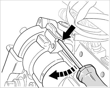 7. Remove cylinder head cover. Unscrew 20 M6 x 30 Torx screws from the cylinder head cover. To loosen the cylinder head cover, raise the cover carefully at the two protruding cast edges with a screwdriver or mounting lever. Remove cylinder head cover.