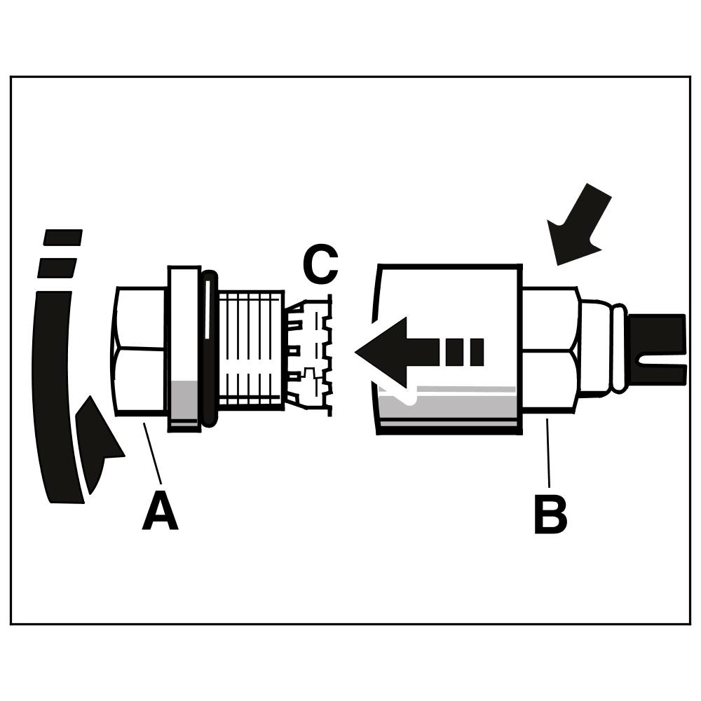43. Fit holder rosette -C- in threaded part -A- and, if necessary, fix using assembly aid 9622. Screw threaded part with new O-ring into the screw coupling -B- and tighten. Counter the coupling when tightening. => Tightening torque: 30 Nm (22 ftlb.) => Tightening torque: 40 Nm (30 ftlb.).