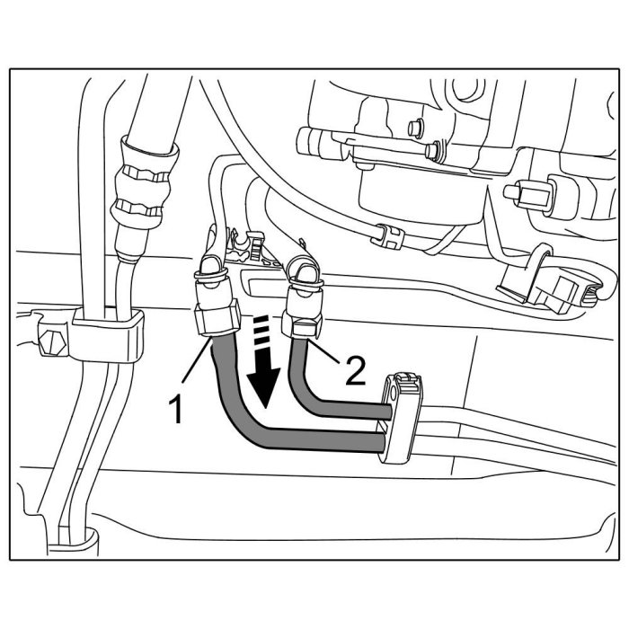 45. Disconnect fuel lines -1- and -2- at underbody. Collect emerging fuel in a suitable container. Seal open lines with suitable plugs.