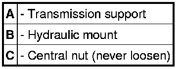 Do not loosen transmission support at the central nut as this will damage the hydraulic mount.