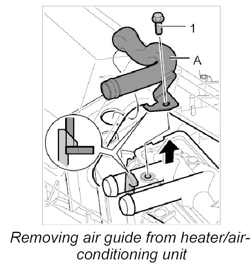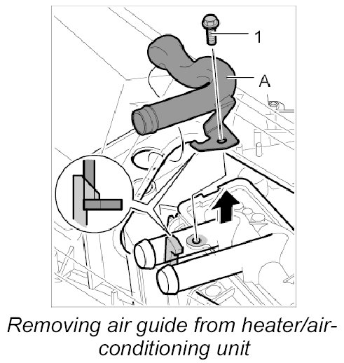2. Unscrew fastening screw -1- for the air guide -A- and pull the air guide out of the heater/air-conditioning unit.