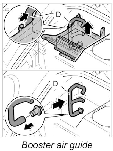 2. Route booster air guide -D- around the body and insert into the upper air guide.