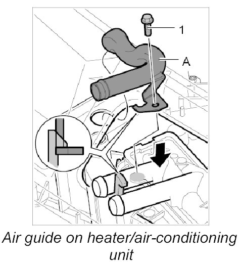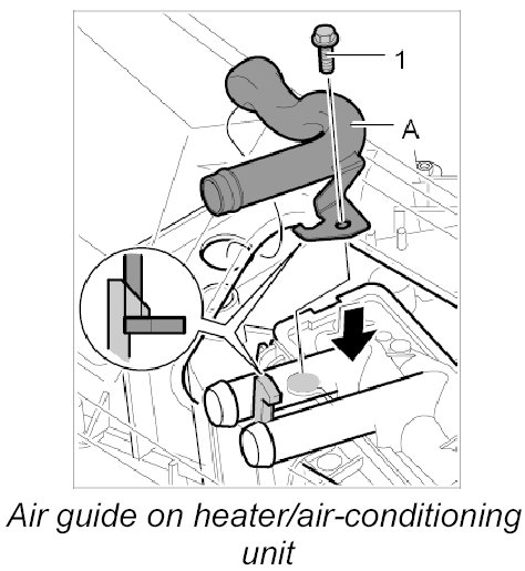1. Press air guide -A- into the heater/air-conditioning unit, clip in place and screw down using the fastening screw -1-.