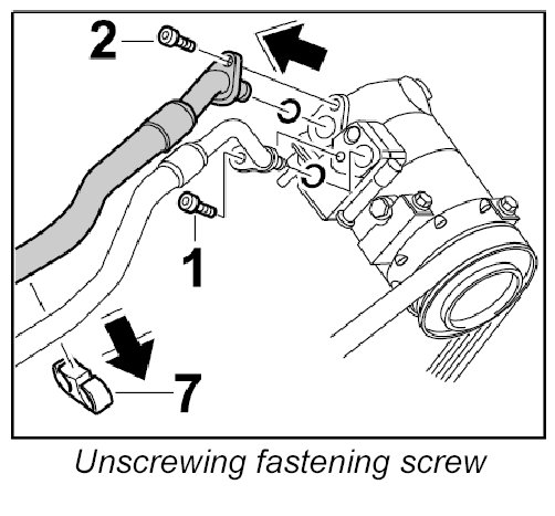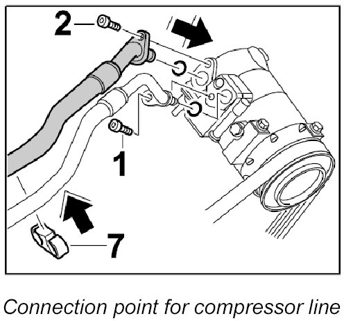 3. Unscrew the refrigerant line between the compressor and condenser at the connection points on the compressor and on the condenser and disconnect it.