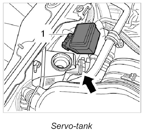 10. Position power-steering reservoir. Lock bayonet lock -Arrow- on power-steering reservoir.