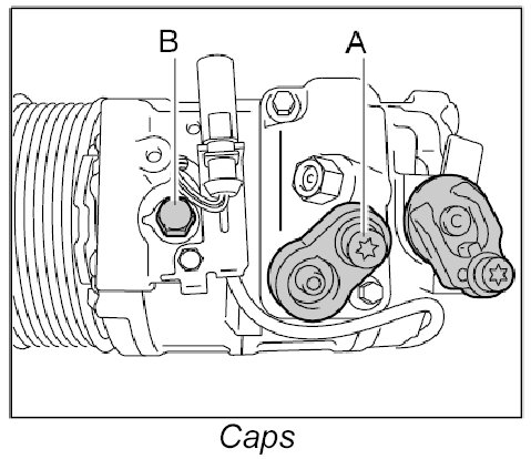 1. 1. First, open the cap on the high-pressure side and relieve the pressure from the compressor -A-.