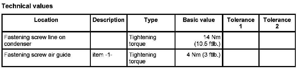 3. Engage air guide on condenser -A- and screw down using the two fastening screws -1-. Tightening torque: 4 Nm (3 ft. lbs.)