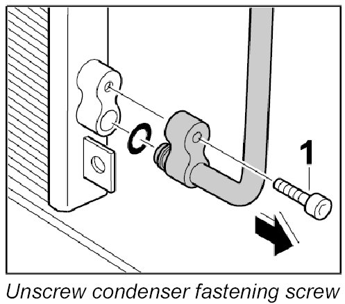 4. Unscrew the fastening screws -1- of the line condenser-condenser and pull the line out of both condensers.