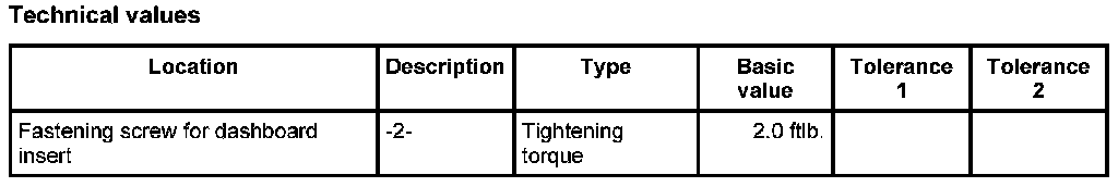 1. Position dashboard insert -1- on the dashboard and screw into place with the seven fastening screws -2-. Tightening torque: 2.0 ft. lbs.