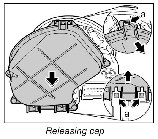 2. Release cap once at the top and twice at the bottom -a- and remove from the main headlight.