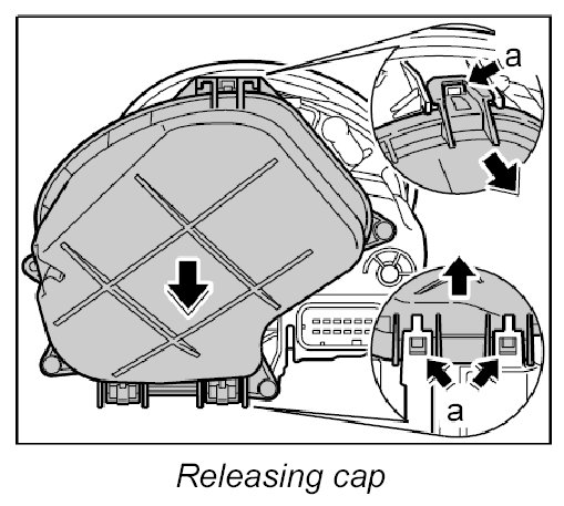 2. Release cap once at the top and twice at the bottom -a- and remove from the main headlight.