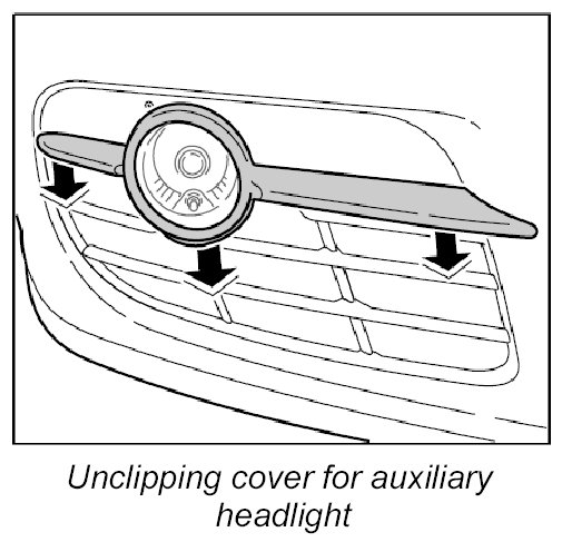 1. Lift up cover for auxiliary headlight from below and unclip it from the front apron.