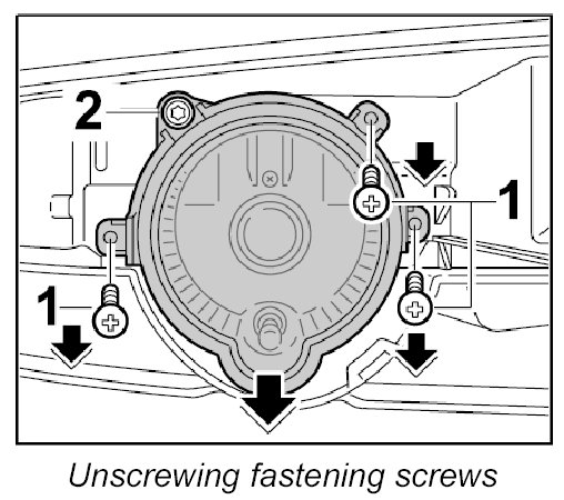 - Using a Torx socket wrench (size 30), adjust the auxiliary headlight through the cover on the adjusting screw -2-.