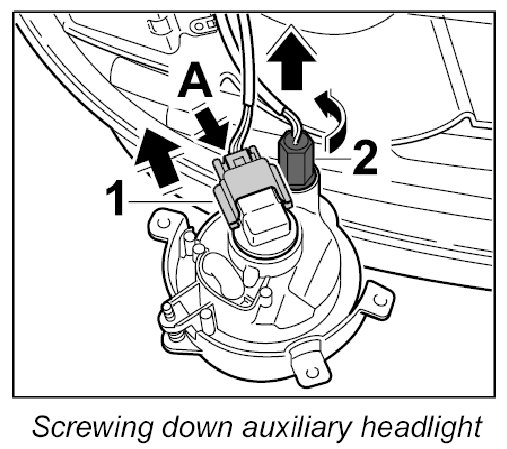 3. Release the electric connector from the fog-light bulb -1- -A- and disconnect it, turn the holder for the parking light -2- (bayonet lock) and remove from the headlight.