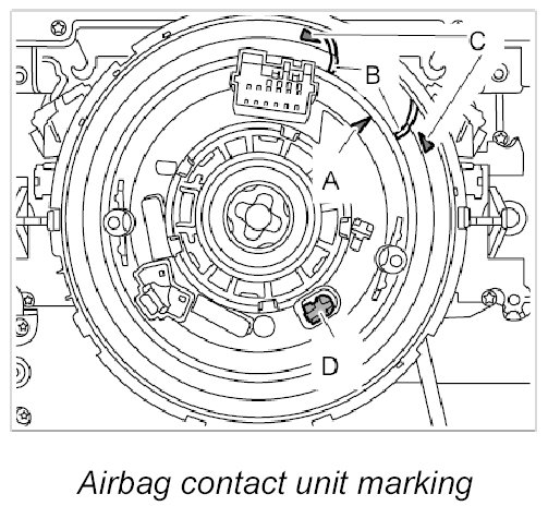INFORMATION: Ensure that arrow -A- on the rotor is positioned between the markings -B- of the arrows -C- on the airbag contact unit and that the locking element -D- is engaged.