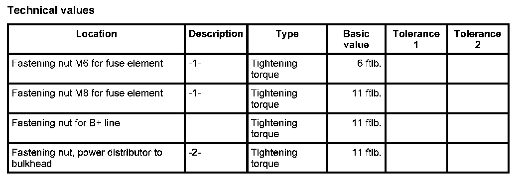 1. Position the fuse elements -3- in the power distributor in accordance with the wiring diagram and position the marked connection leads in turn, fit the washer -2- and tighten with the fastening nuts -1-. Tightening torque: 6 ft. lbs. Tightening torque: 11 ft. lbs.
