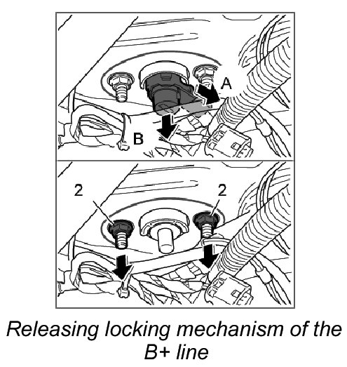 2. Position the B+ line on the power distributor and tighten with the fastening screws. Tightening torque: 11 ft. lbs.