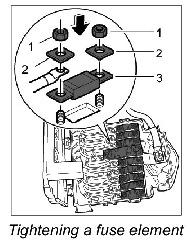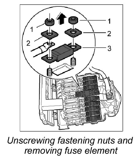9. Unscrew the fastening nuts -1- , remove the washer -2- and take out the fuse element -3-.