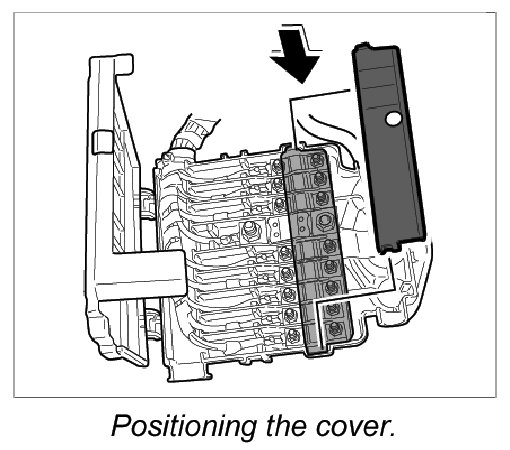 6. Slide the power distributor upwards between the heater/air-conditioning unit and the bulkhead, and engage in the bulkhead.