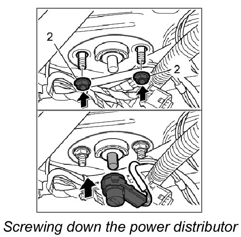 7. Screw down power distributor with the two fastening screws -2-. Tightening torque: 11 ft. lbs.
