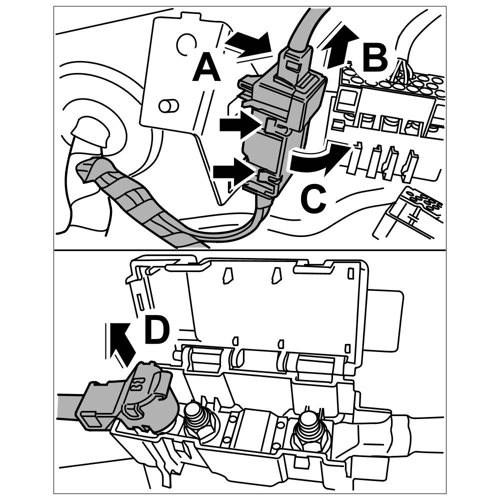 8.2. Release connector sockets for main wire harness -arrows C- and push down from retaining clip -arrows D-.