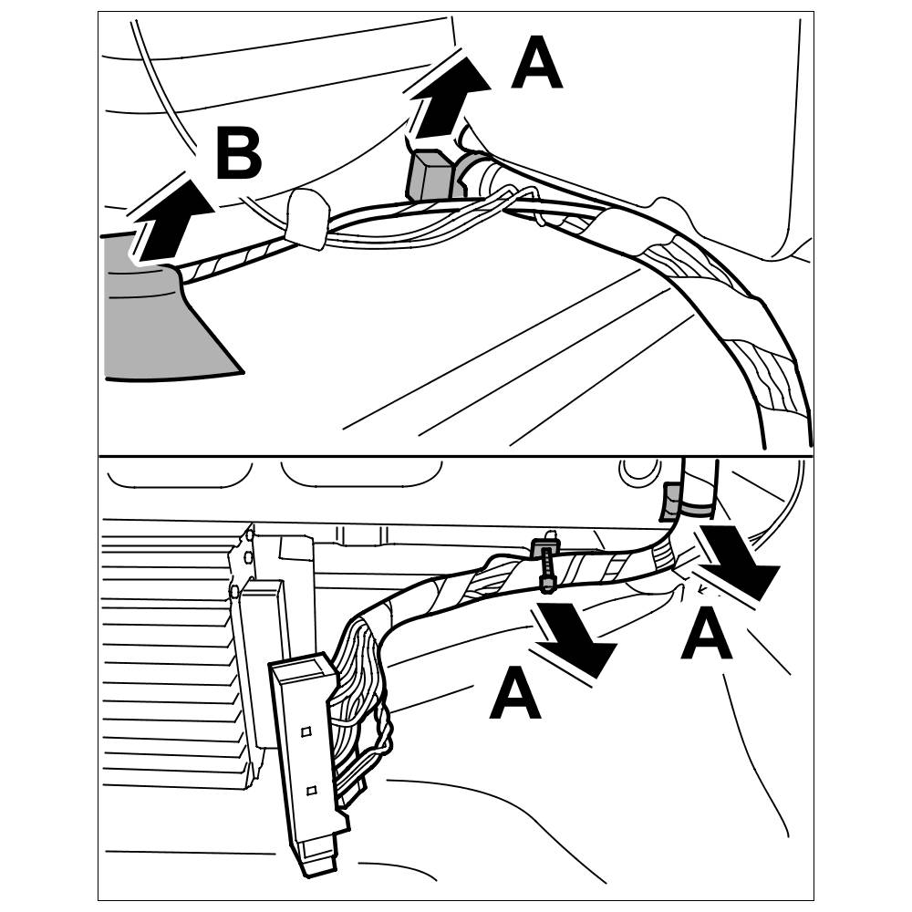 9. Unclip wire harness to loudspeaker amplifier -Arrows A- and remove adhesive tape -Arrow B-.