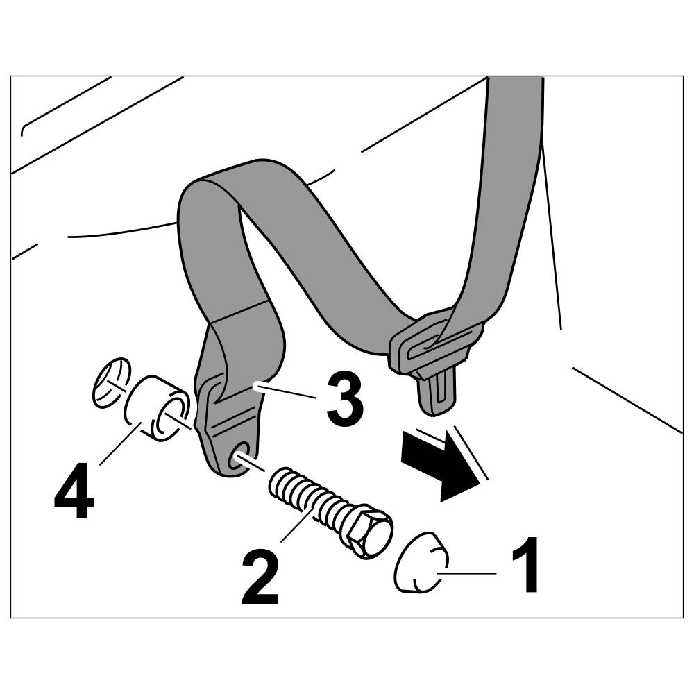1.1. Press off cap -1- with a screwdriver and unscrew the fastening screw -2-. Remove seat belt with fitting -3- and spacer sleeve -4-.