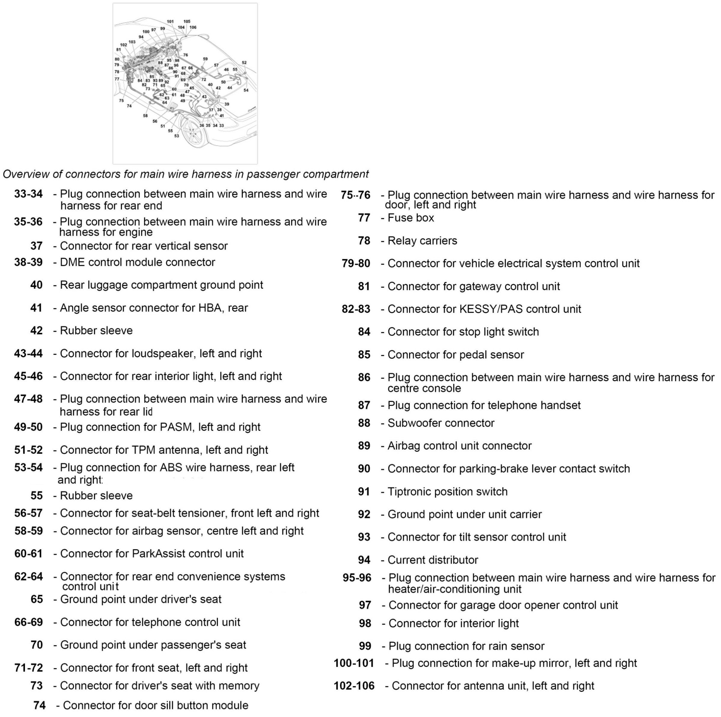 8. Push on connector for antenna amplifier, left and right -102 to 106-.