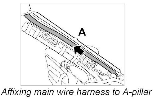 9. Remove protective film of adhesive strip on main wire harness -area A- and affix main wire harness to A-pillar.