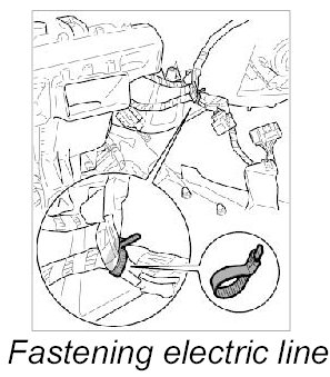 14. 1. Lay main wire harness to heater/air-conditioning unit wire harness and fix with a tie-wrap.