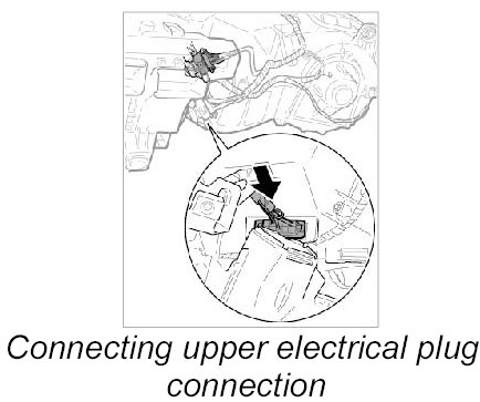 14. 2. Push in upper electric plug connection at heater/air-conditioning unit until it is felt to engage.
