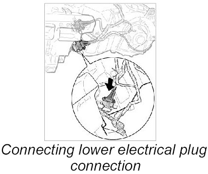 14. 3. Push in lower electric plug connection at heater/air-conditioning unit until it is felt to engage.