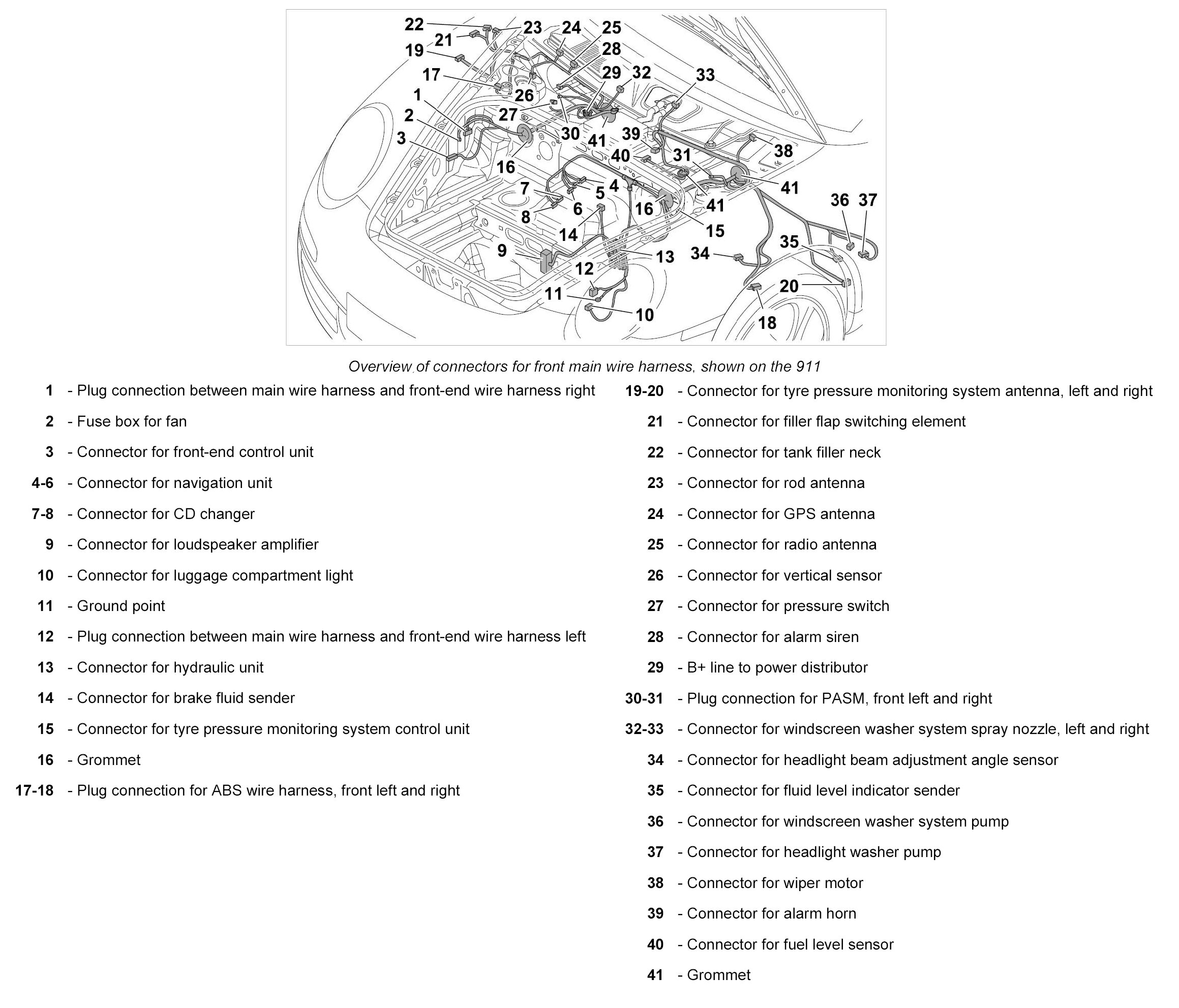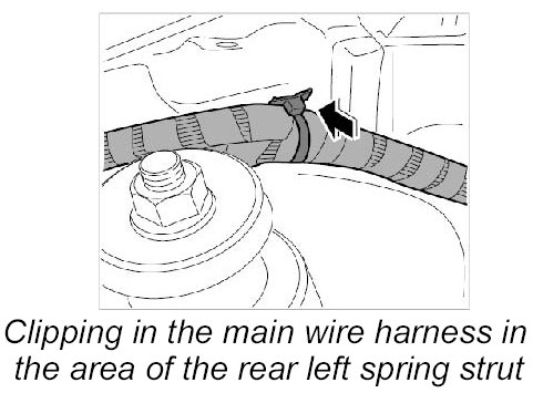 33. Clip in the main wire harness in the area of the rear left spring strut.
