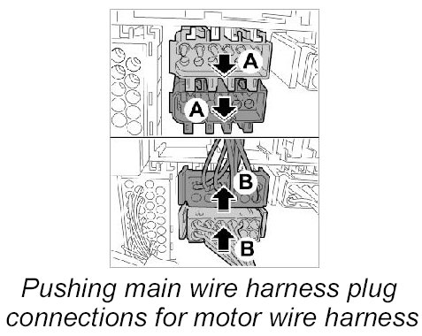 43. 2. Push plug connections for main wire harness to motor wire harness together -arrows B- , until these are felt to engage.